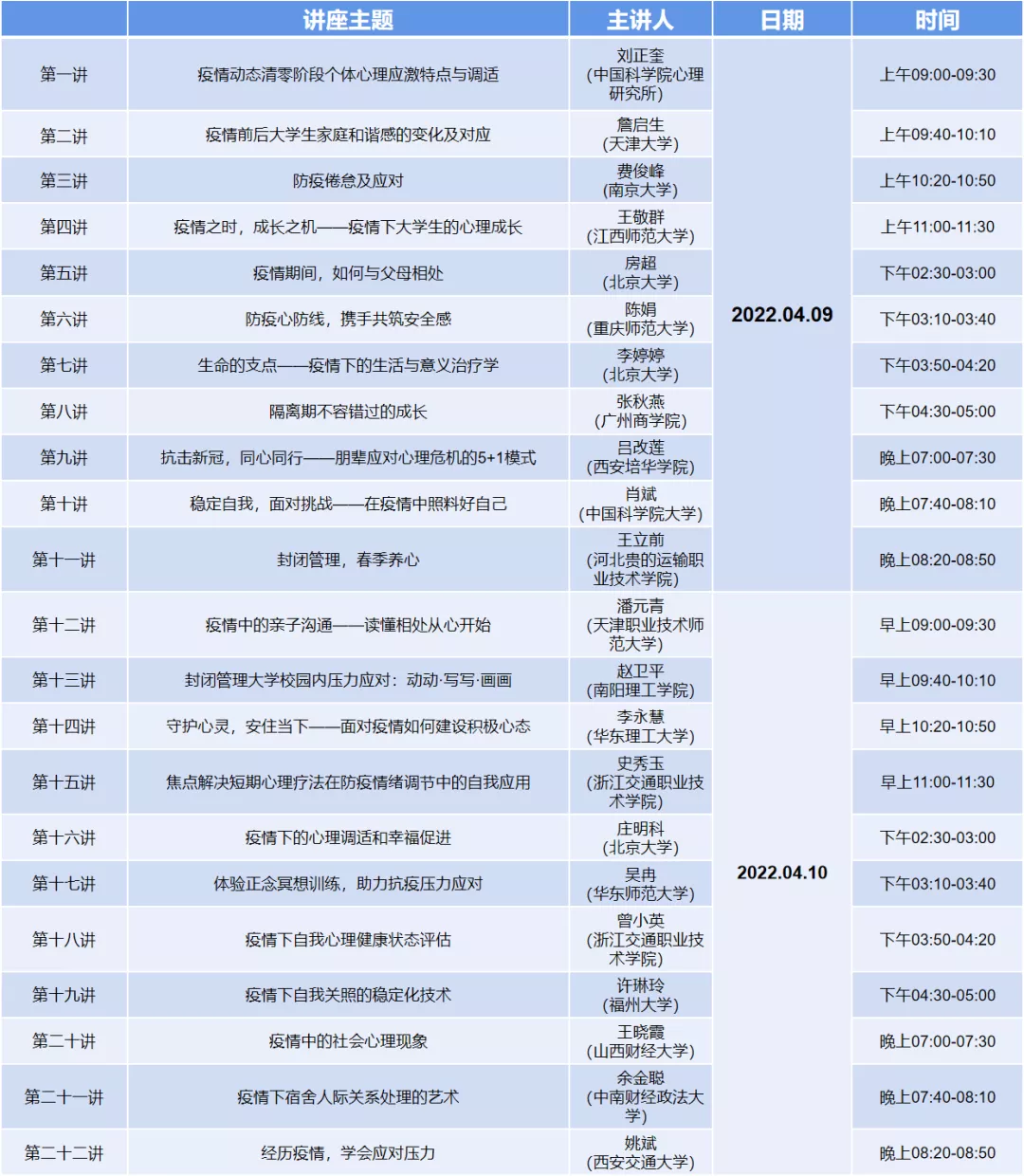 随着全国多地陆续发现多起新型冠状病毒肺炎确诊病例,各地纷纷实行封禁政策,在校大学生群体中出现诸多心理健康问题,因此,中国心理学会心理危机干预工作委员会及全国高校心理委员研究协作组织于2022年4月9-10日面向全国高校学生开展“抗击疫情全国心理委员大讲堂”系列公益讲座。太阳成集团tyc234cc主页积极响应号召,组织各班心理委员线上观看本次公益讲座。