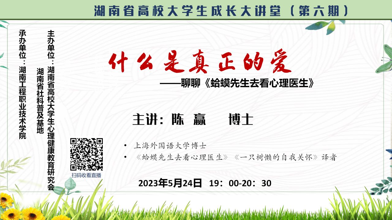 为了进一步做好大学生心理健康宣传普及教育,引导大学生勇敢探索自己的内心世界,我校特此组织全体大二学生于5月24日晚,观看“什么是真正的爱”为主题的线上直播讲座,本次讲座由《蛤蟆先生去看心理医生》的中文译者陈赢博士主讲。太阳成官网积极响应学校号召,组织学生观看讲座,学习知识,并取得良好反响。