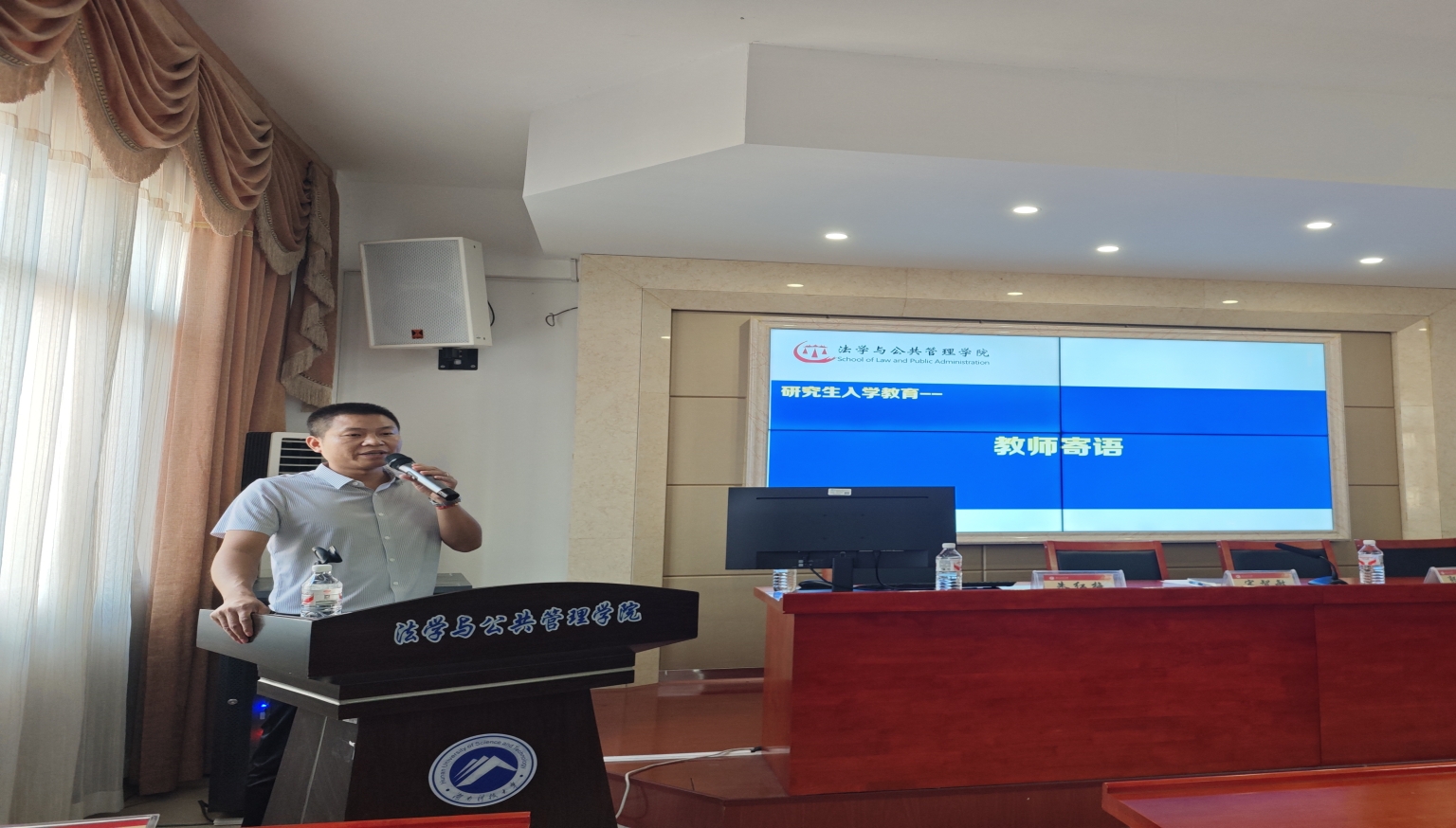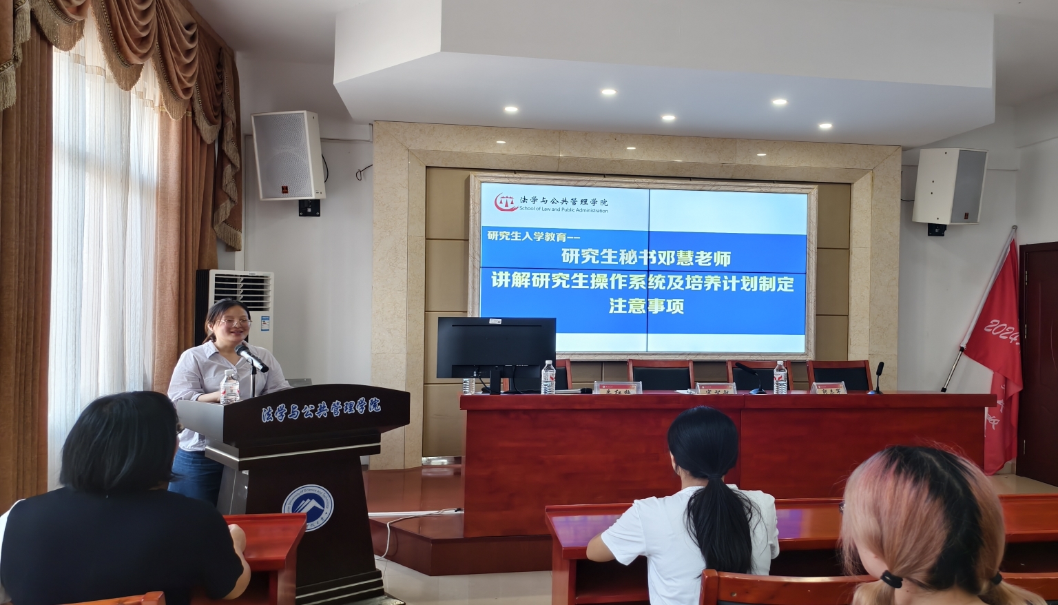 开学典礼后,入学教育环节由研究生辅导员郭志军主持。法学硕士学位点负责人雷连莉就该学位点培养目标、课程设置、科研要求及毕业条件等进行了详细介绍。